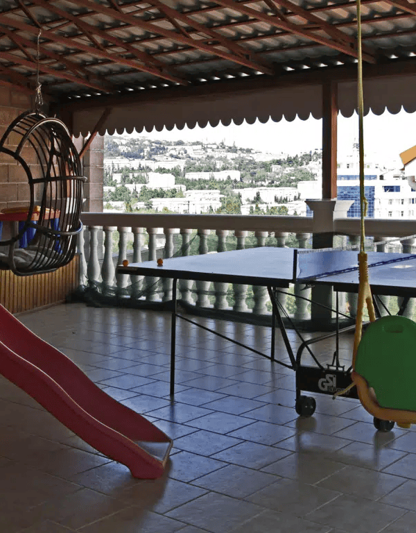 с песочницей, качелями, горкой, теннис и тренажер