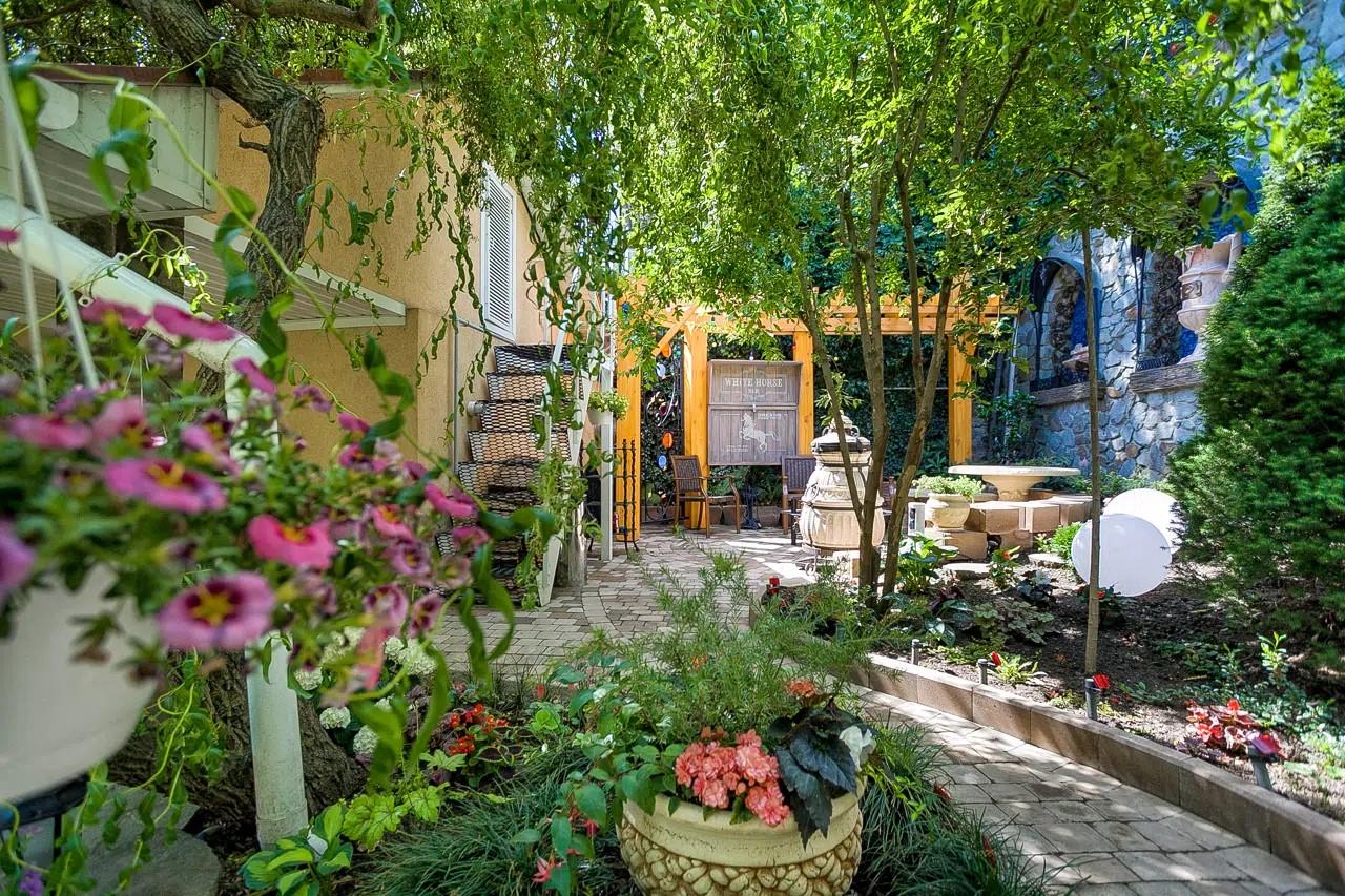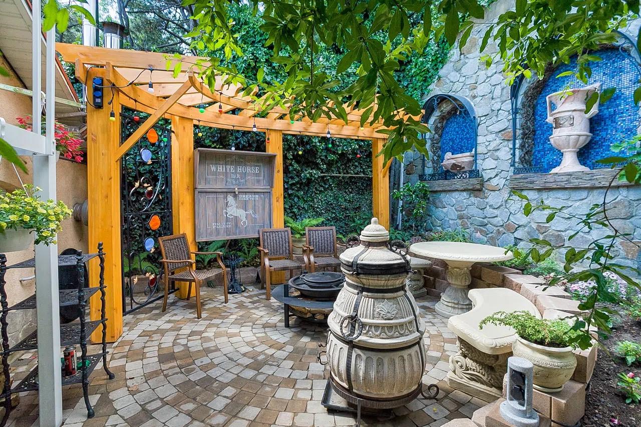 Еще один романтичный уголок с костровой чашей (можно приготовить мясо на открытом огне или просто наблюдать за потрескивающими поленьями в языках пламени), тандыром (можем приготовить для Вас потрясающее сочное томленое мясо с овощами в этой глиняной печи). Пергола не только защищает от яркого летнего солнца, но и создает неповторимую атмосферу в ансамбле с многочисленными экзотическими растениями, которые здесь цветут круглый год.