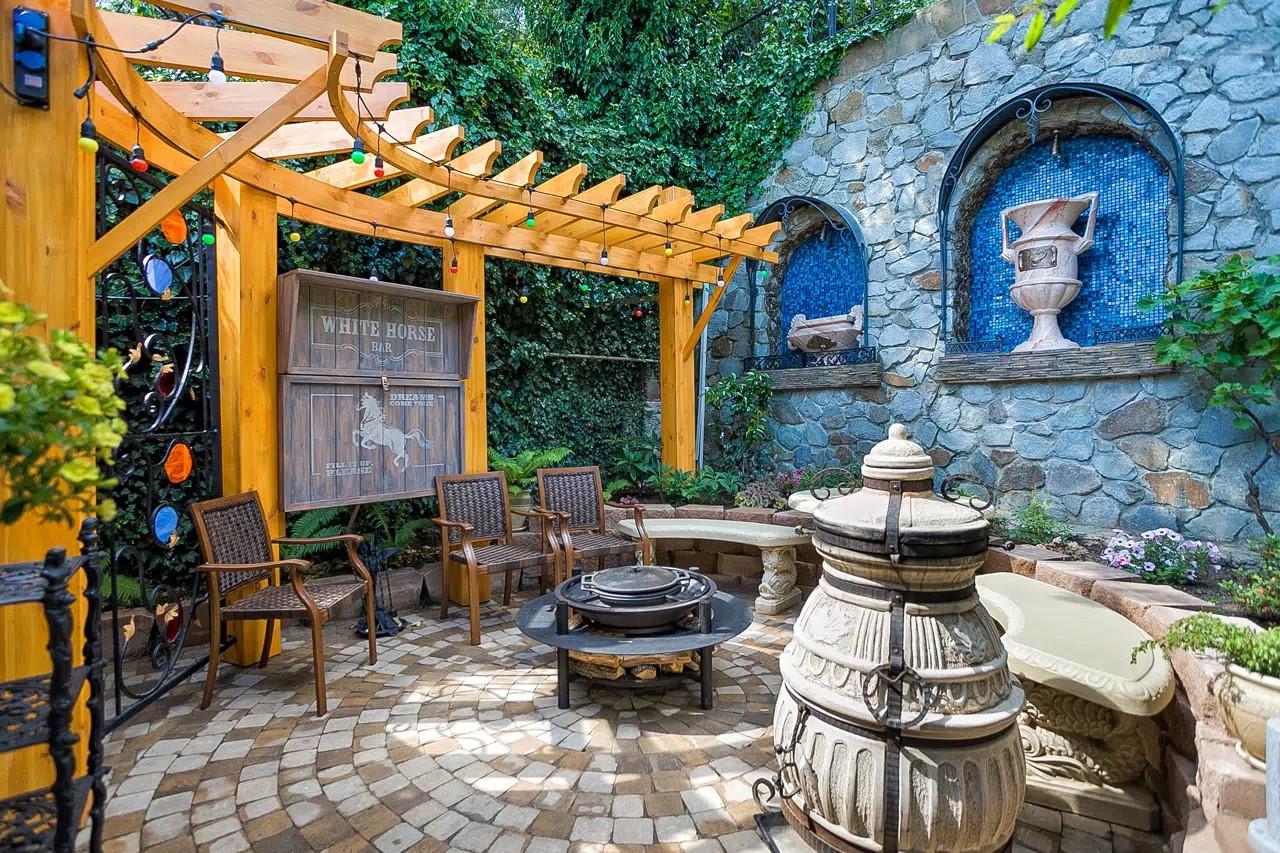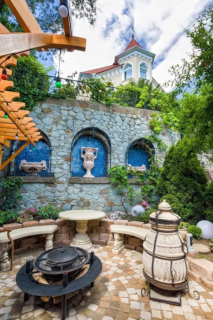 Еще один романтичный уголок с костровой чашей (можно приготовить мясо на открытом огне или просто наблюдать за потрескивающими поленьями в языках пламени), тандыром (можем приготовить для Вас потрясающее сочное томленое мясо с овощами в этой глиняной печи). Пергола не только защищает от яркого летнего солнца, но и создает неповторимую атмосферу в ансамбле с многочисленными экзотическими растениями, которые здесь цветут круглый год.